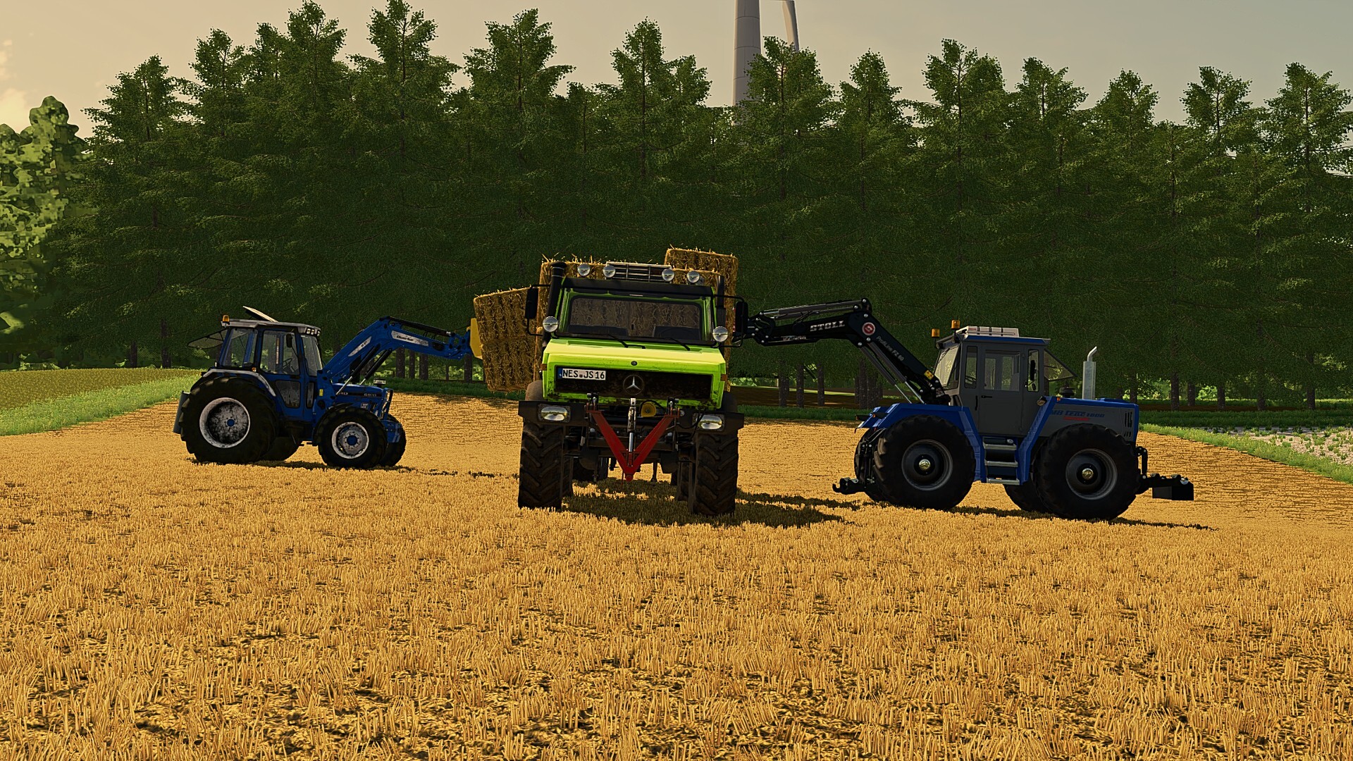 Mit der Traumkombi Ballenladen und Fahren. Der Ford 6810 und der MB Trac 1800 am laden und der 1600er Unimog am abfahren