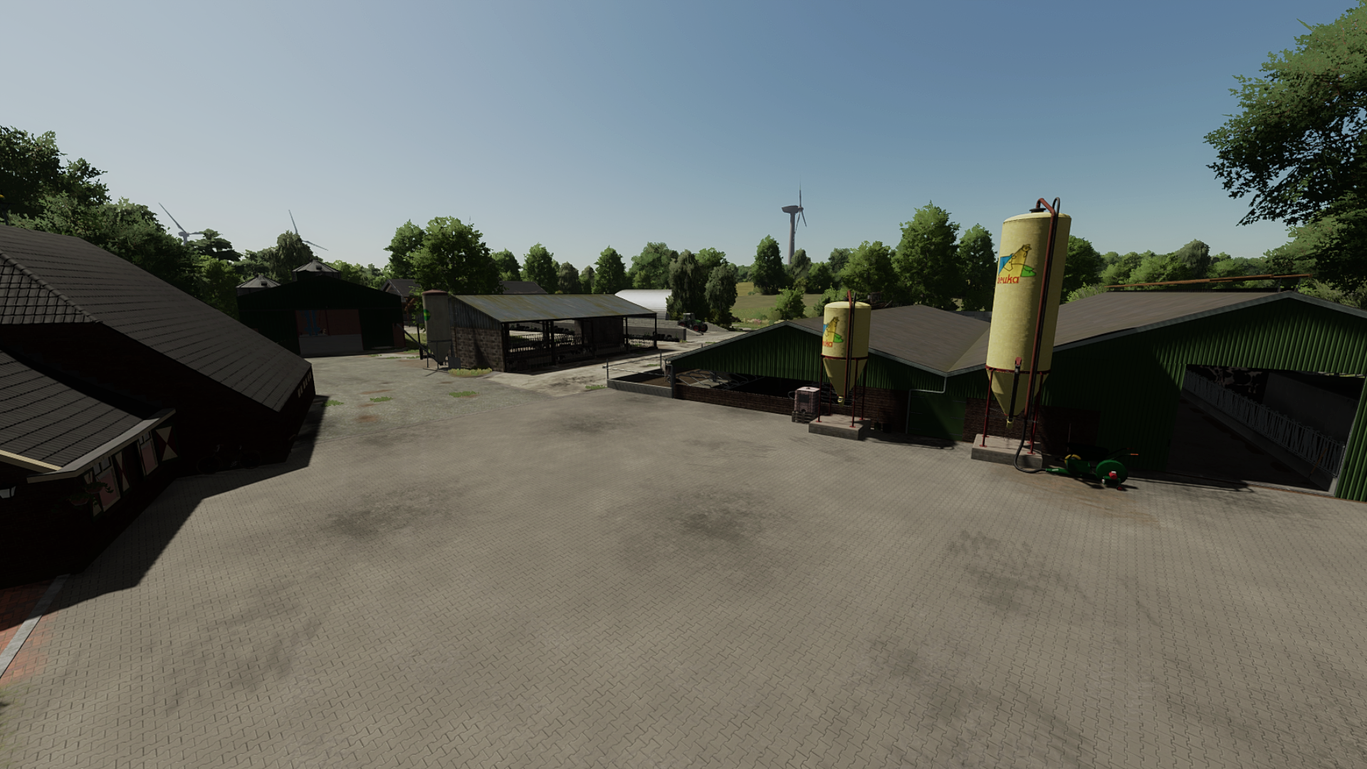 Bullen-Kälberstall - Güllesilo zum umpumpen in Güllewagen - mittlere Kuhstall mit dahinterliegender Weide - Getreidelager Halle - und Rübenlage