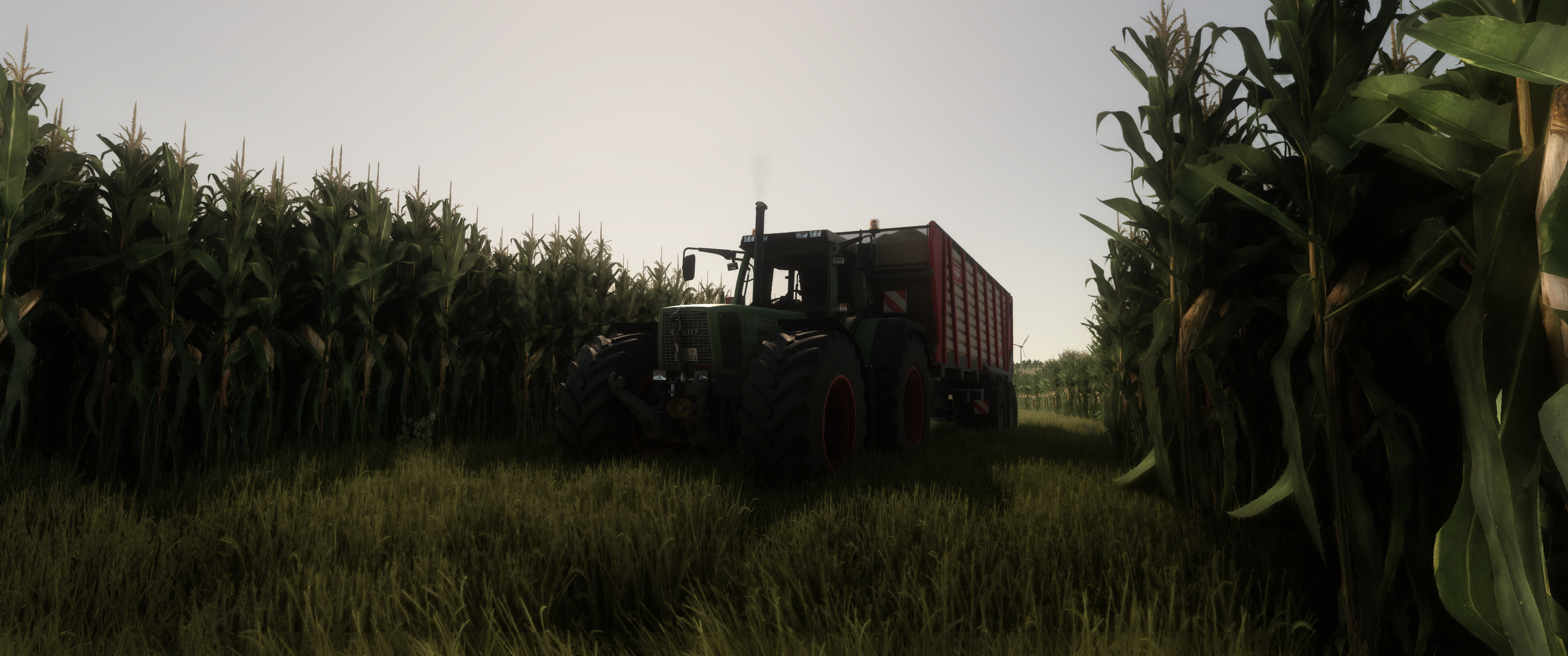 Das Foto zeigt einen Fendt Favorit 824 mit einem Krampe Radium 830, der bereits mit frischem Häckselgut beladen ist und gerade vom Feld fährt.Die goldene Nachmittagssonne taucht die Szene in warmes Licht.