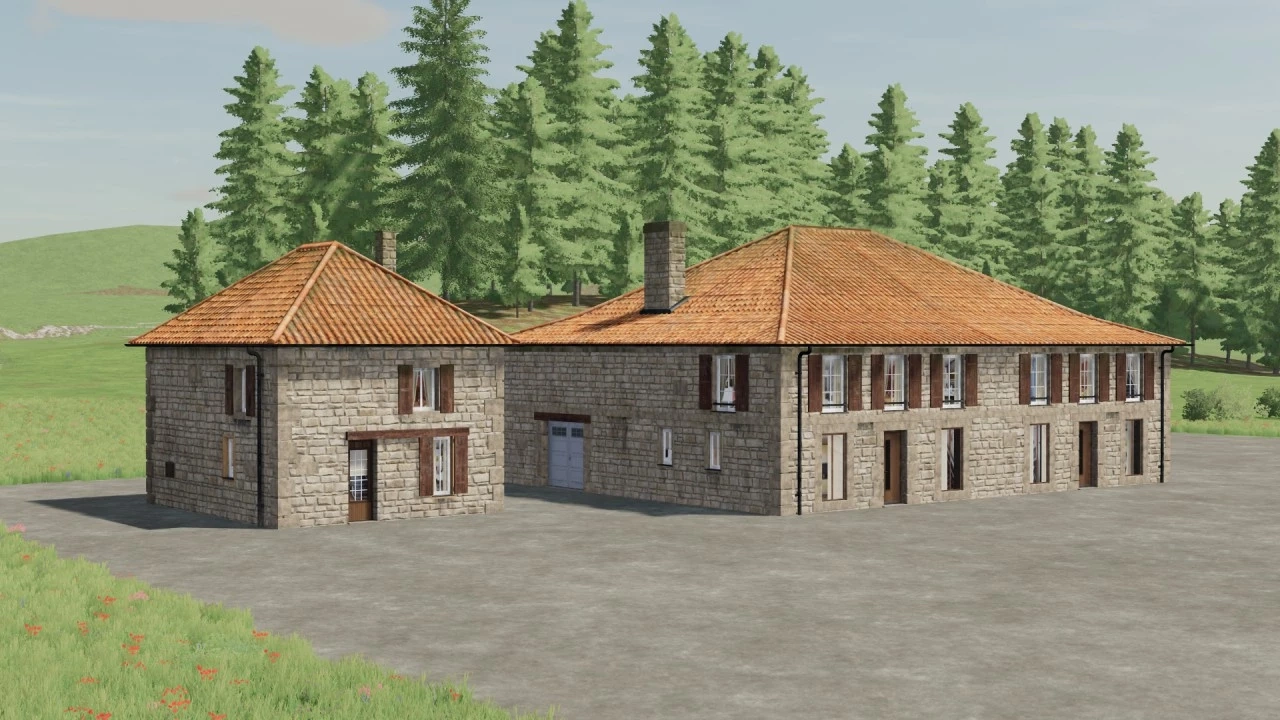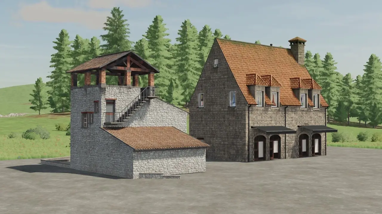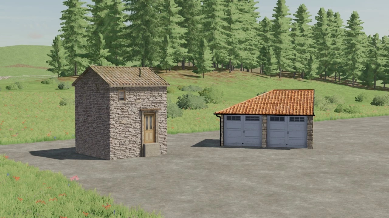 Pack of 10 placeable decorative houses including a garage as well as a well and a fountain.
