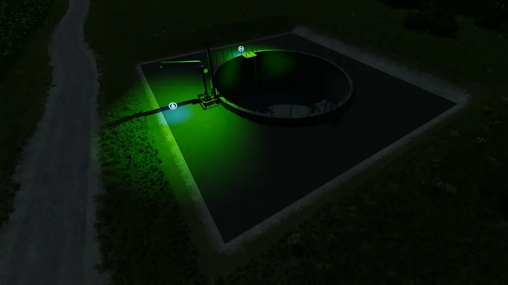 Diese Gülletanks sind in den Boden eingelassen und verfügen über eine wachstumsfreundliche grüne Beleuchtung