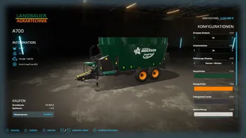Der Landbauer A700 ist ein Umbau des Futtermischwagen von dem Hersteller Anderson Group. Ausgestattet mit Konfigurationen zur Wahl von Warndreieck, zusätzlichem Arbeitslicht, Füllstandsanzeigen und Farbwahlen zur individuellen Gestaltung, ist der A700 mit seinen 24.000 L Füllvolumen ideal für mittelgroße Betriebe geeignet.