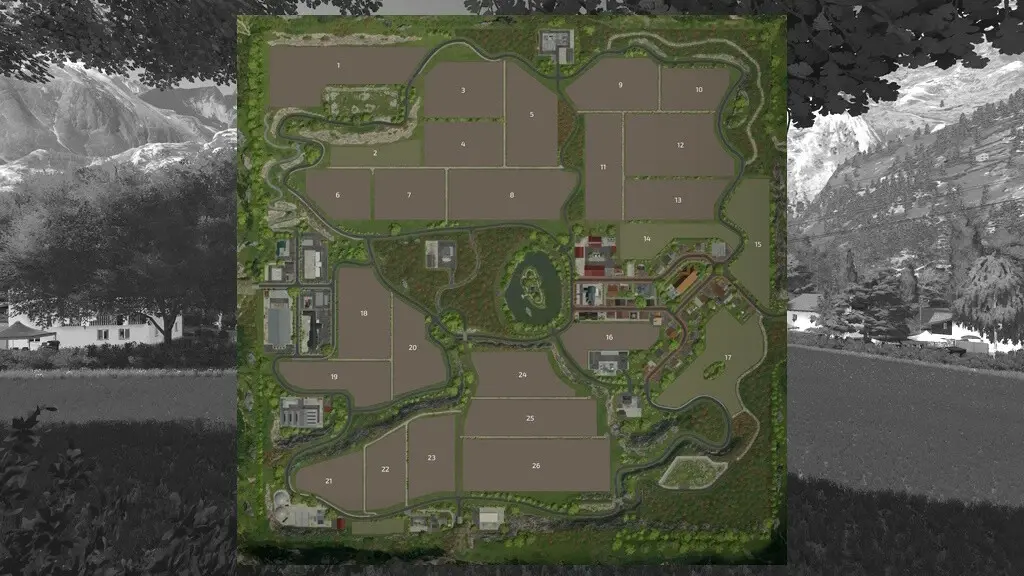 - 26 Felder (davon 4 Wiesen), 6 kaufbare Waldflächen und 3 Bauplätze