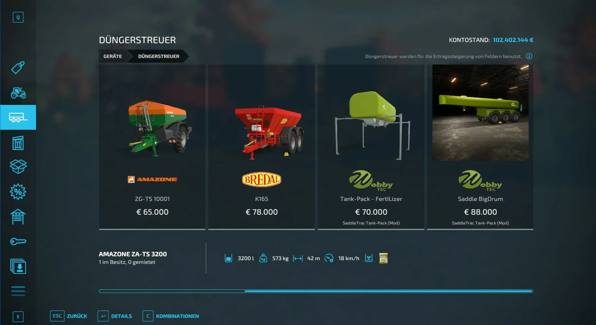 - in Kombination mit einem der DüngerStreuer wird der Tankinhalt von 25.000 L des "Tank-Pack - FertiLizer" dem Inhalt des DüngerStreuers kombiniert/addiert