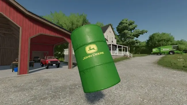 Es ist ein Metallfass im John Deere Design. Ihr findet es bei der Dekoration, bei den Gartenhäusern.