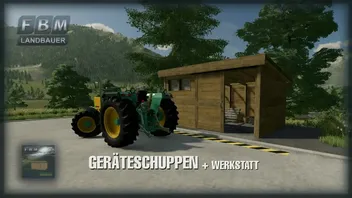 Ein einfacher Geräteschuppen aus Holz mit Schiebetor und Innenbeleuchtung. Wahlweise leer, mit etwas Innendoration und Werkstattfunktion um Fahrzeuge und Maschinen zu reparieren, ändern, etc.