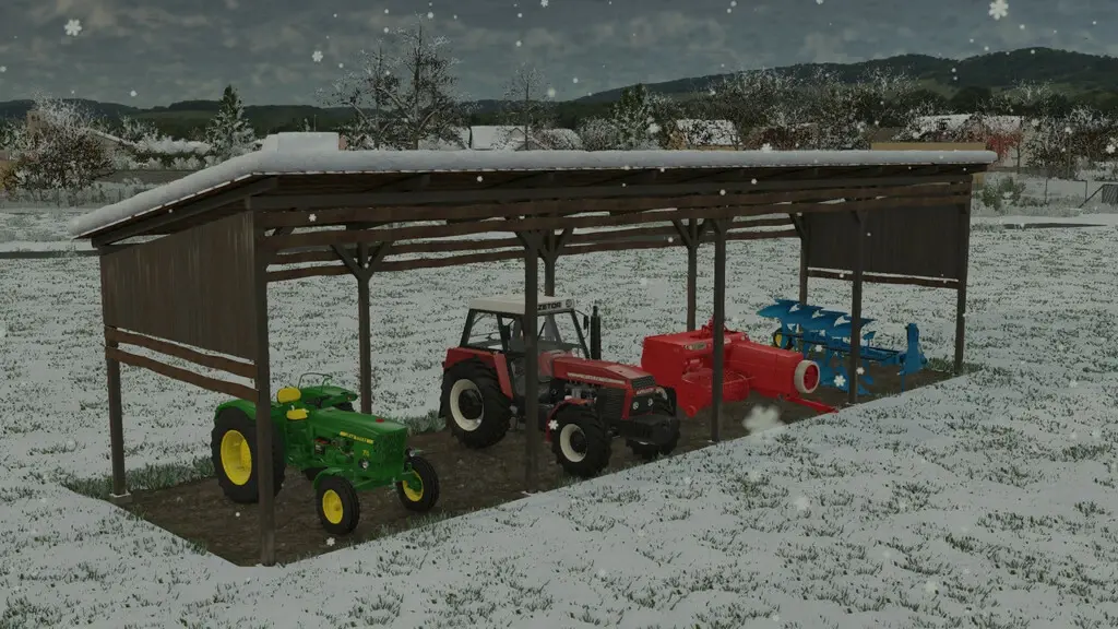 Holzschuppen für landwirtschaftliche Maschinen.