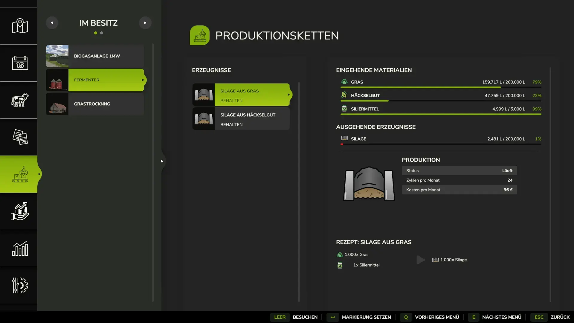 Es kann jetzt bei der Produktion auf das Menü zugegriffen werden bei der Grastrocknung und dem Fermenter