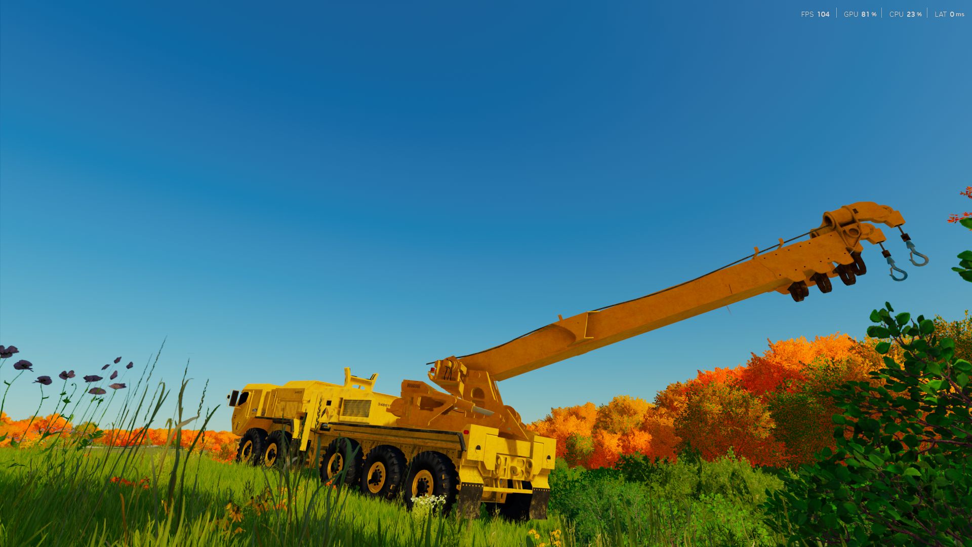 Großer gelber mobiler Kran. Aufgrund seines Designs scheint es ein Kran für schwere Konstruktion und Hebeaufgaben zu sein