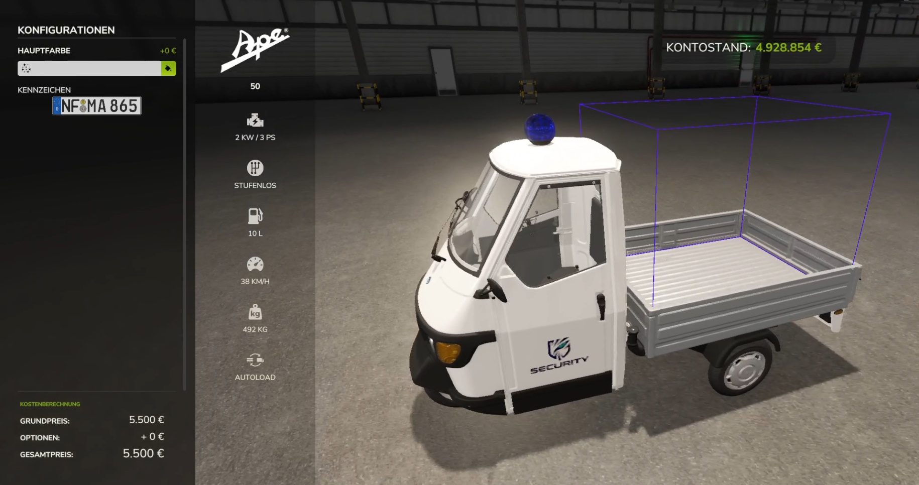 Die Ape ausgerüstet mit Blaulicht und Security-Aufdruck. Für den Transport von kleinen Dingen oder einer einzelnen Palette.Downloadlink: https://sites.google...