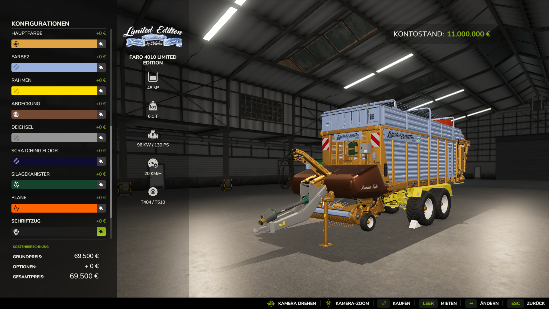 Farbwahl fuer Hauptfarbe, Designfarbe, Rahmen, Abdeckung, Deichsel, Scratching Floor, Silagekanister, Plane, Schriftzug und Felgenfarbe